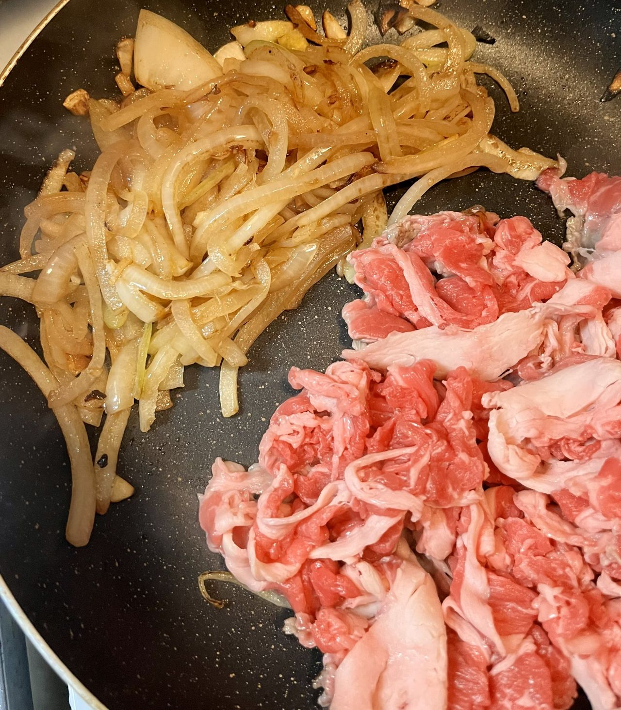 こうやってフライパンを半分ずつ使うことを覚えると、自分で何か適当に作るときにも役に立ちますね。厚切りの牛肉高くてかえませんで・・・小間切れです。しかも量がちょっと多いのしかなくて、牛肉だらけになっています。