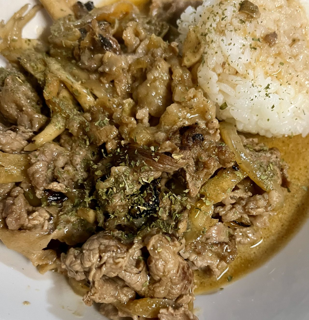 あっという間に完成!肉肉しいビーフストロガノフとなってしまいました。。。見た目が牛丼のようです。ご飯は冷凍していたものを使っているので、なんだかおにぎり型のまま。まあいいですね。ひとりで食べるんだし。