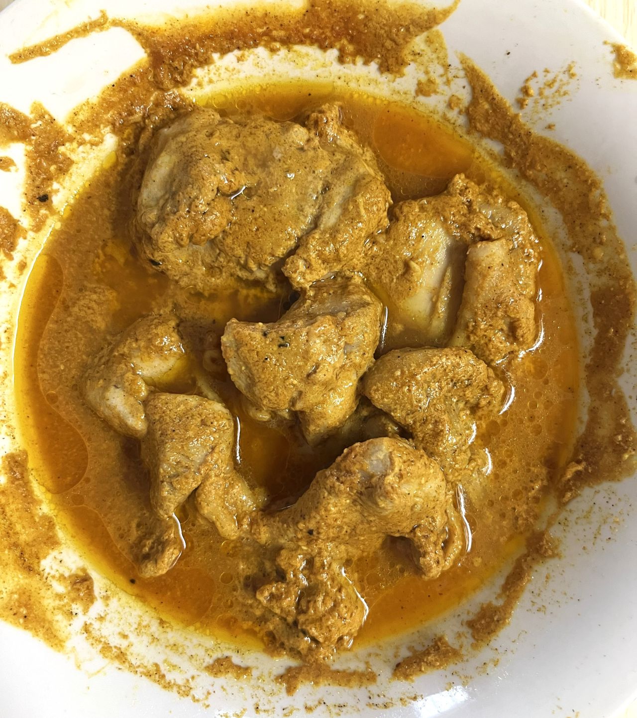もも肉をカレーに入れて混ぜてレンジでチンした後。火が通っているか若干心配になりました。が大丈夫でした。もちろん火が通ってなかったらさらに加熱が必要です。
