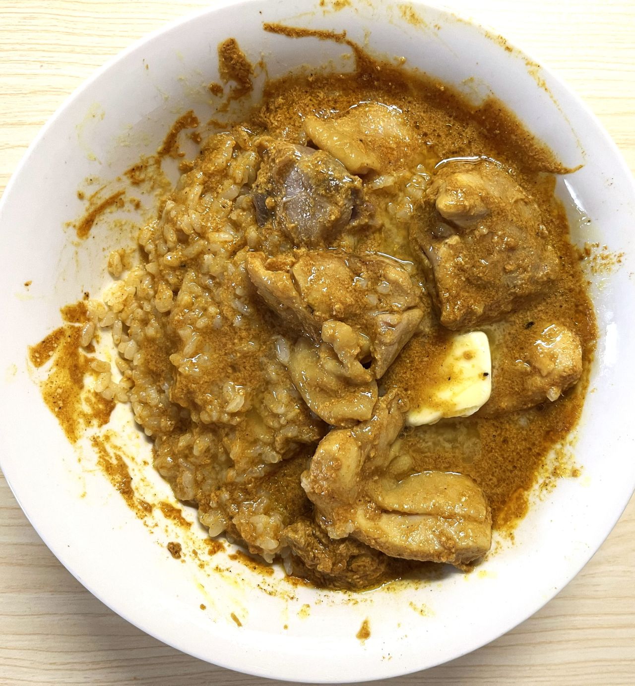 できました!ご飯をよそってカレーに投入して混ぜてやりました。バターが溶けていい香り。カレーは混ぜるだけ。もも肉切って、カレーとレンジで加熱。ご飯と合わせてバターをON。これだけで完成。