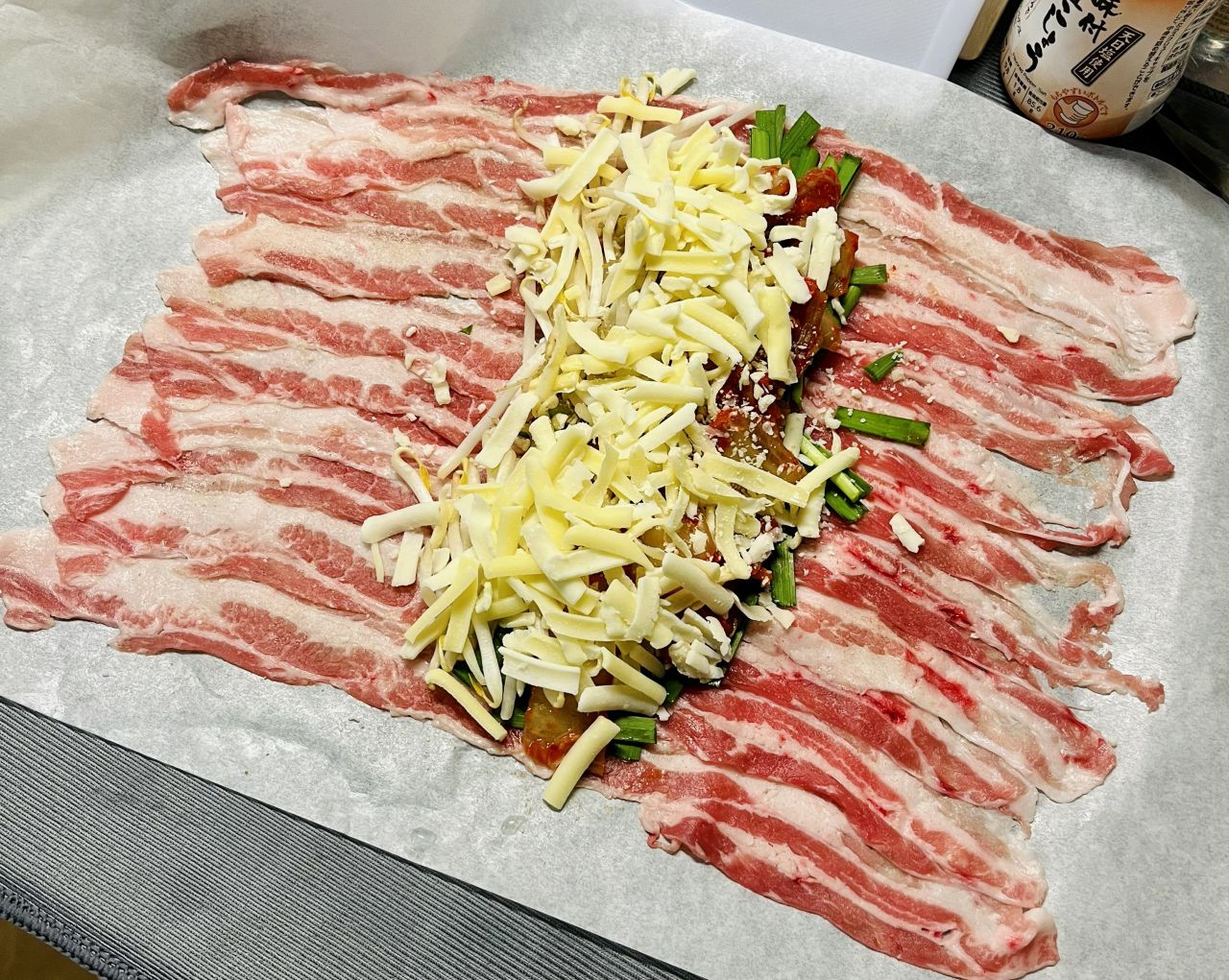 瓶にラップを被せて叩きました。簡単に広がってくれたバラ肉さん。ここミス。食材を置く場所ちょっと真ん中すぎ!もっとどちらかに寄せないといけません。皆さんご注意を!