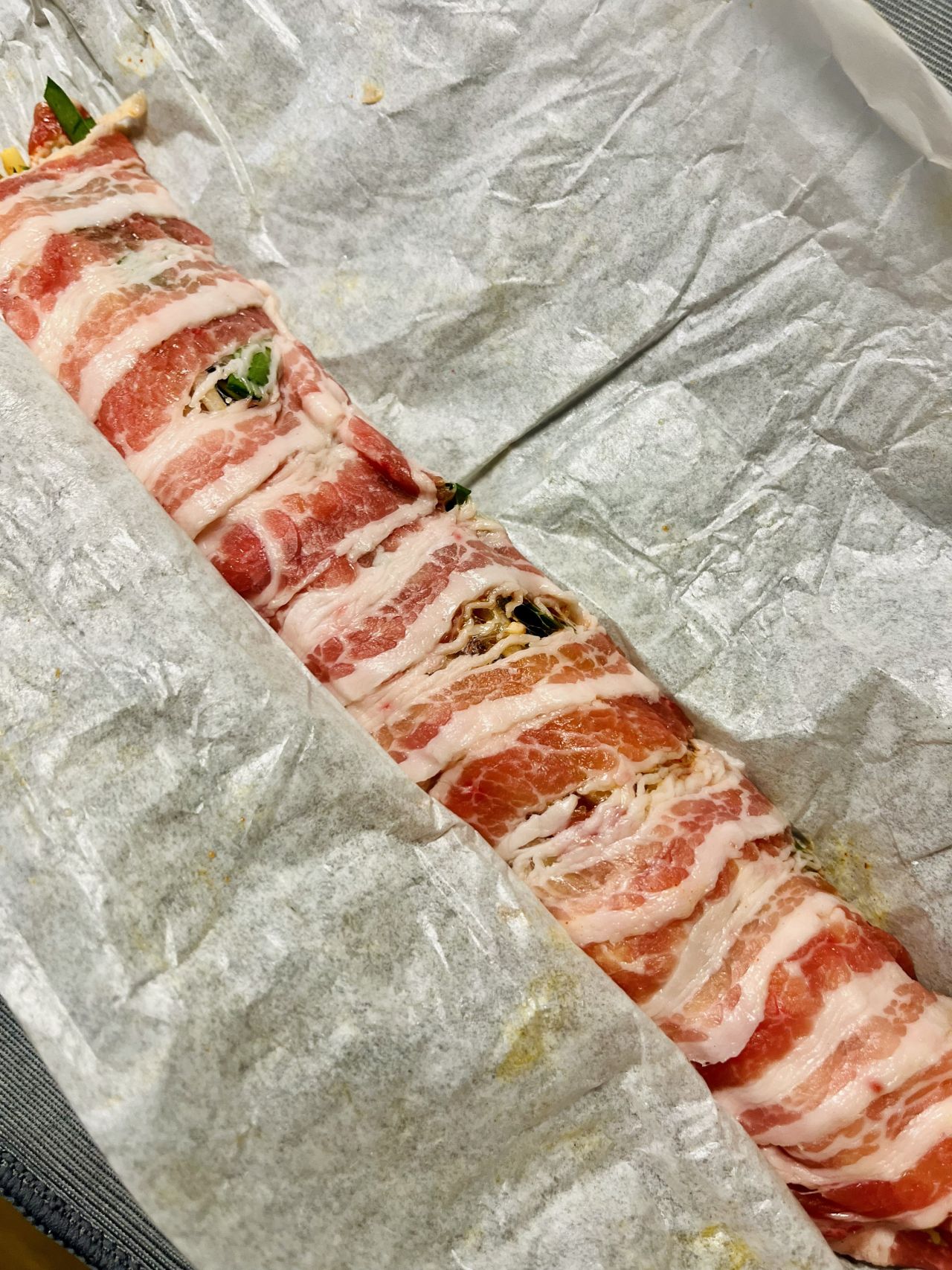 とはいうものの力ずくで思いっきり巻いてやりました。ただ、ここで注意点は、バラ肉叩いているので、クッキングシートにへばりついているということ。うまく剝がしながら向きを変えてくださいね。