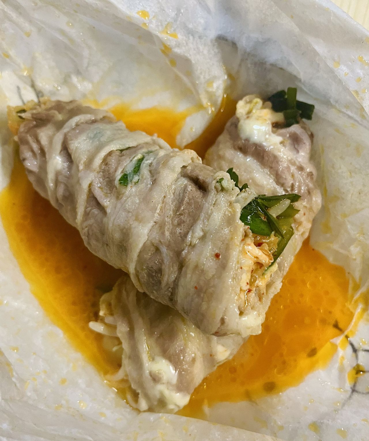 食べてみると、実に美味い!これポイント高い!キムチとチーズってとても合いますね。そこにニラともやしも絡んできて食べ応えもアップ。バラ肉はキムと相性良いですし、完璧な時短料理。半分に切った時もス~っと切れて形も崩れることなし。あまりに美味いの1本全部いただきました。で、この溜まったスープ。これをご飯と一緒に食べる、うまい!大満足です。皆さんも一度おためしあれ。