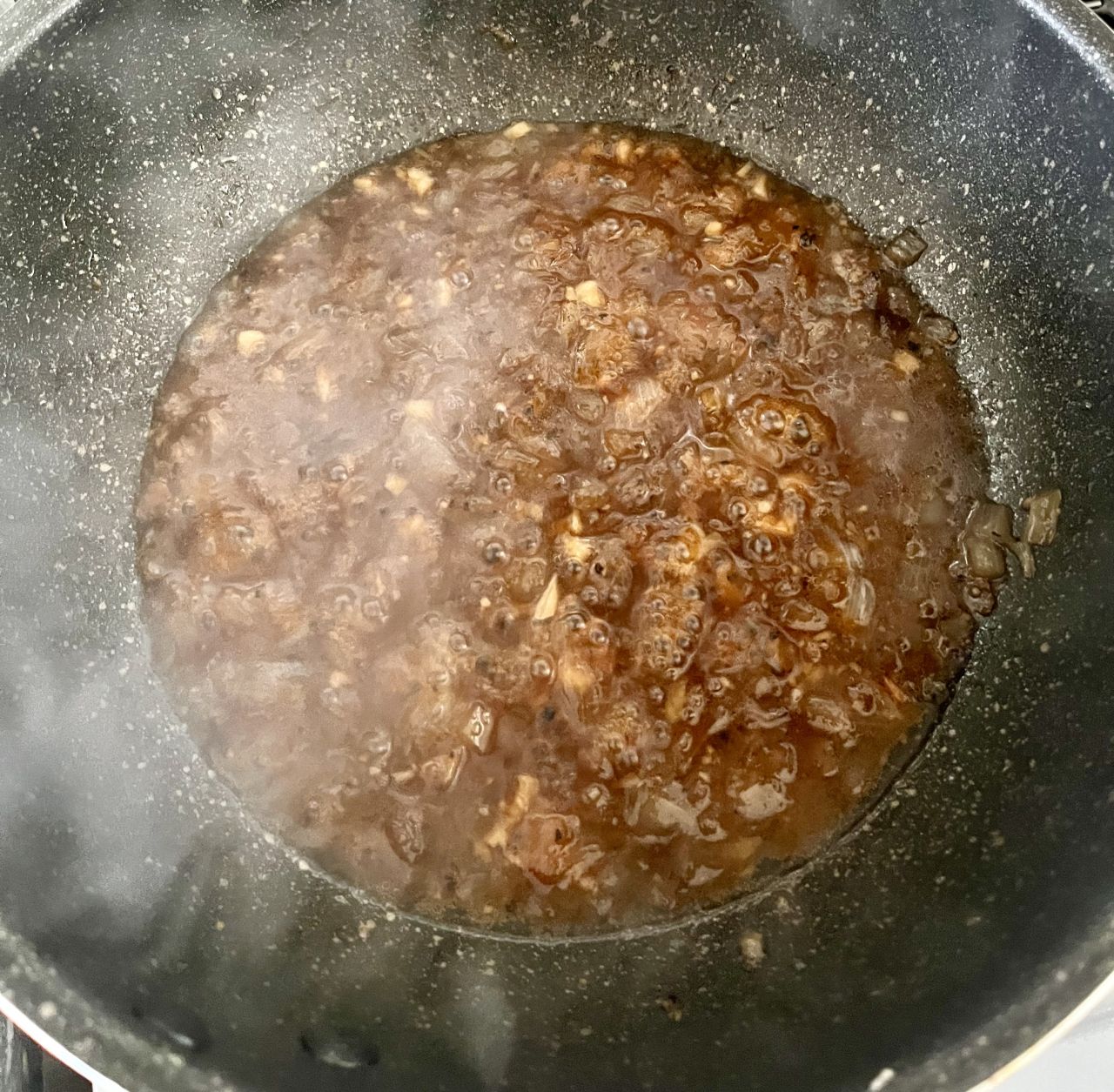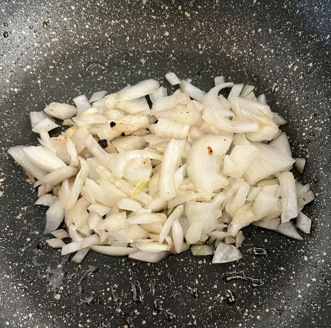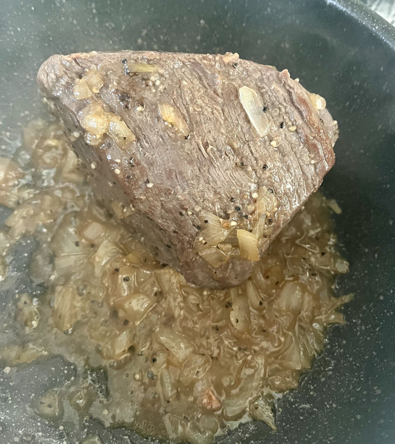 蒸し焼きの途中画像。とてもいい感じに焼けているようです。画像でも確認できるように玉ねぎから水分が出てだいぶ広がっています。この後、さらに広がり肉を裏返すときに中央に集めましたが、すぐに広がってしまいしっかりとした土台にはなっていませんでした。ただ、なんとか直接フライパンには触れない程度には頑張ってくれました。
