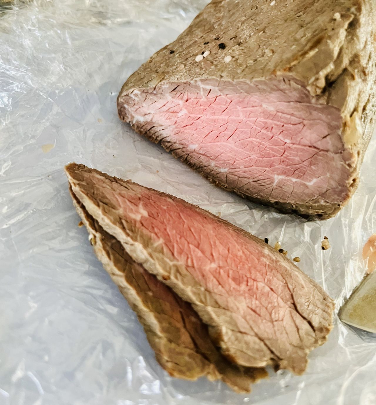冷蔵庫で一日近く寝かせまして期待と不安のカットしてみると、うむ!ピンク色。これぞローストビーフ!