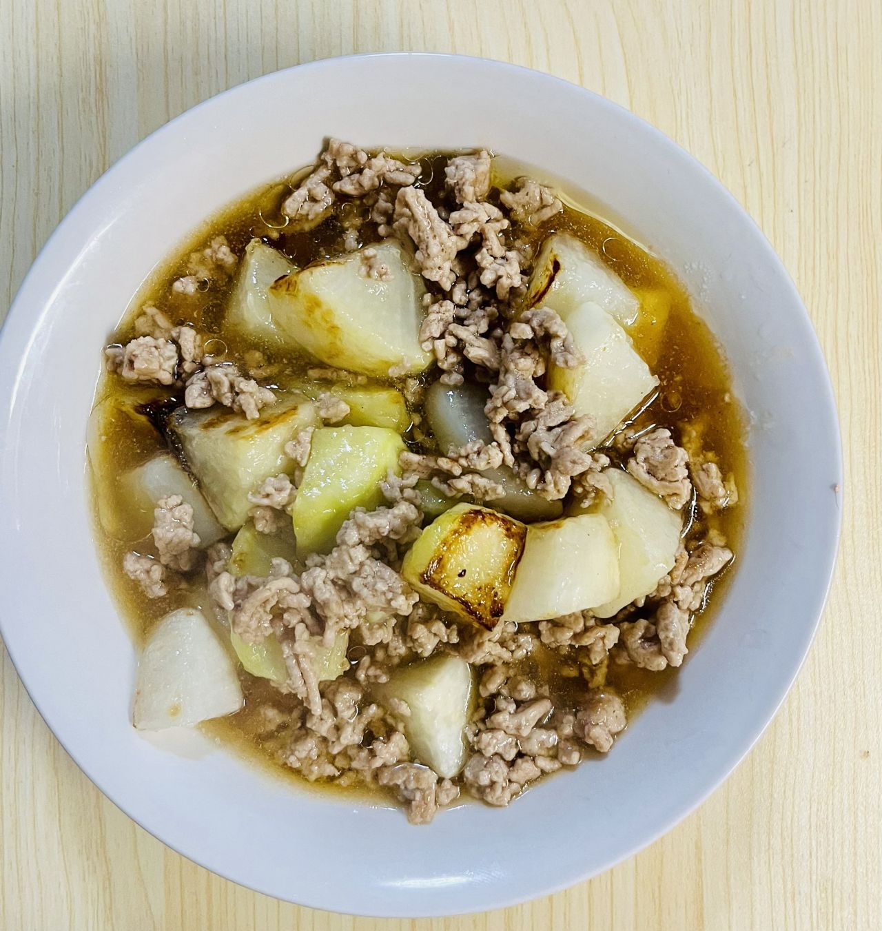 焼き色をうまく全体につけることができませんでしたが、レンジで加熱してあったtのでホクホク大根を食べられました。あんが大根に絡んで味のしっかりと楽しめる一品。とてものシンプルな和風味が気に入りました。ミンチは適当に入れたので量はやや多め。ほどよくお腹も満たされ大満足。やっぱりあんは暖まります。