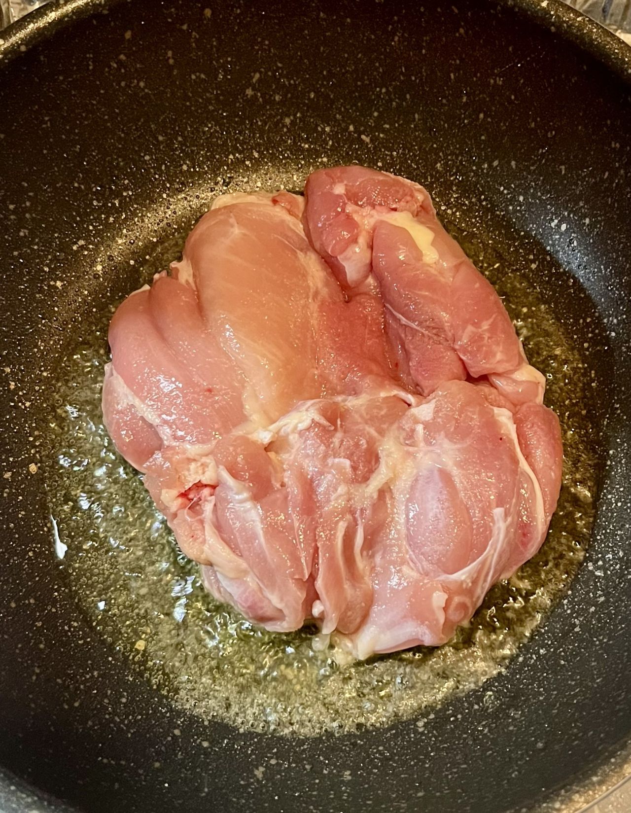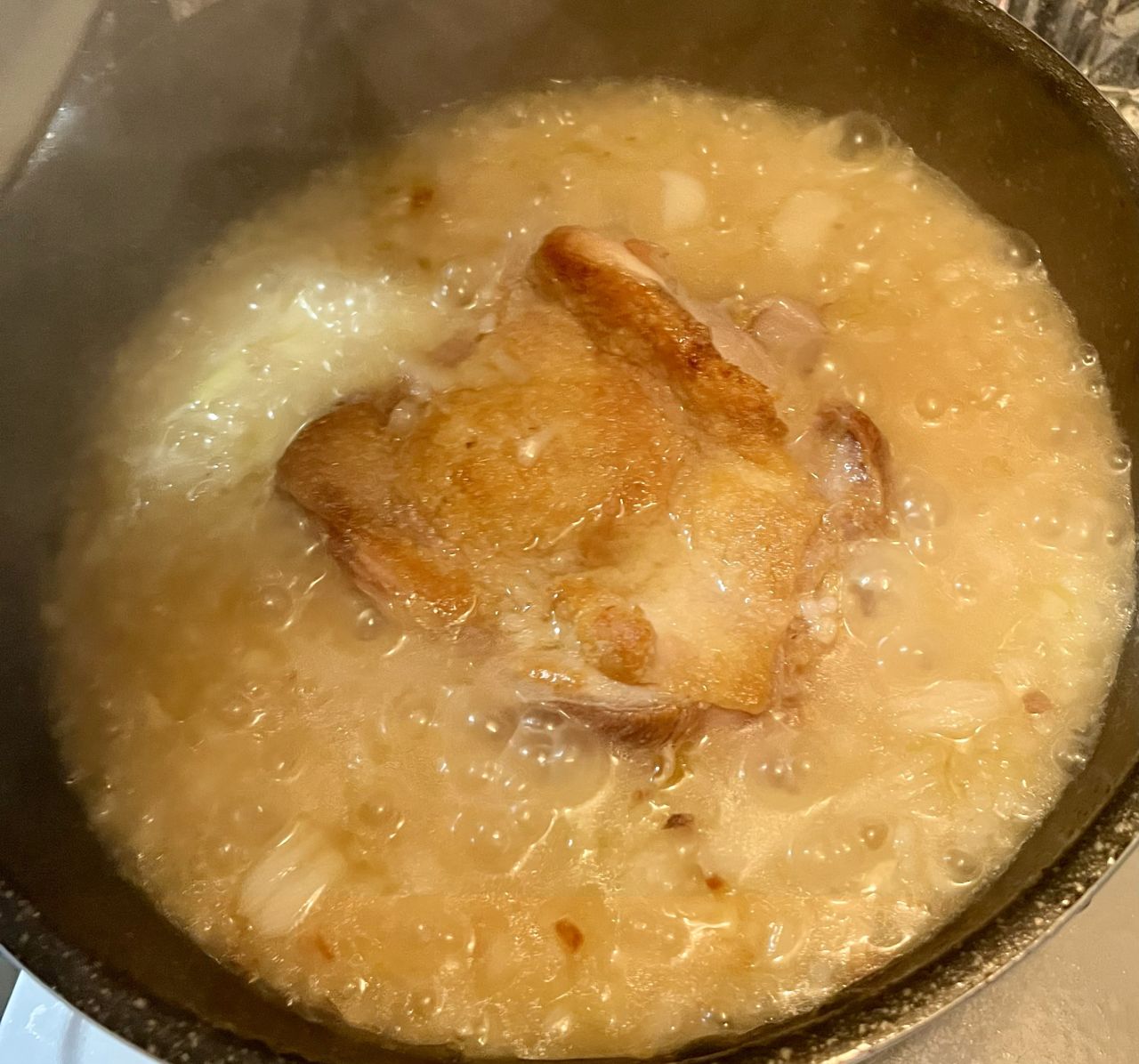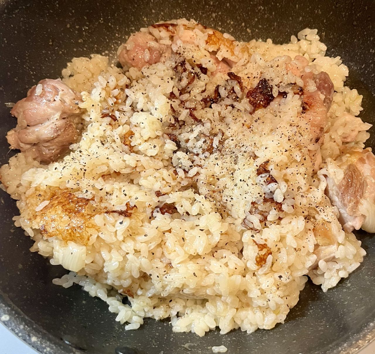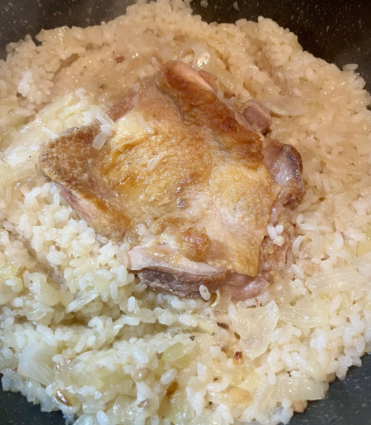 もも肉を焼いてニンニク、玉ねぎを炒めて米投入。水を入れて丸鶏がらスープを入れたりして炊いているところです。リゾットみたいですね。