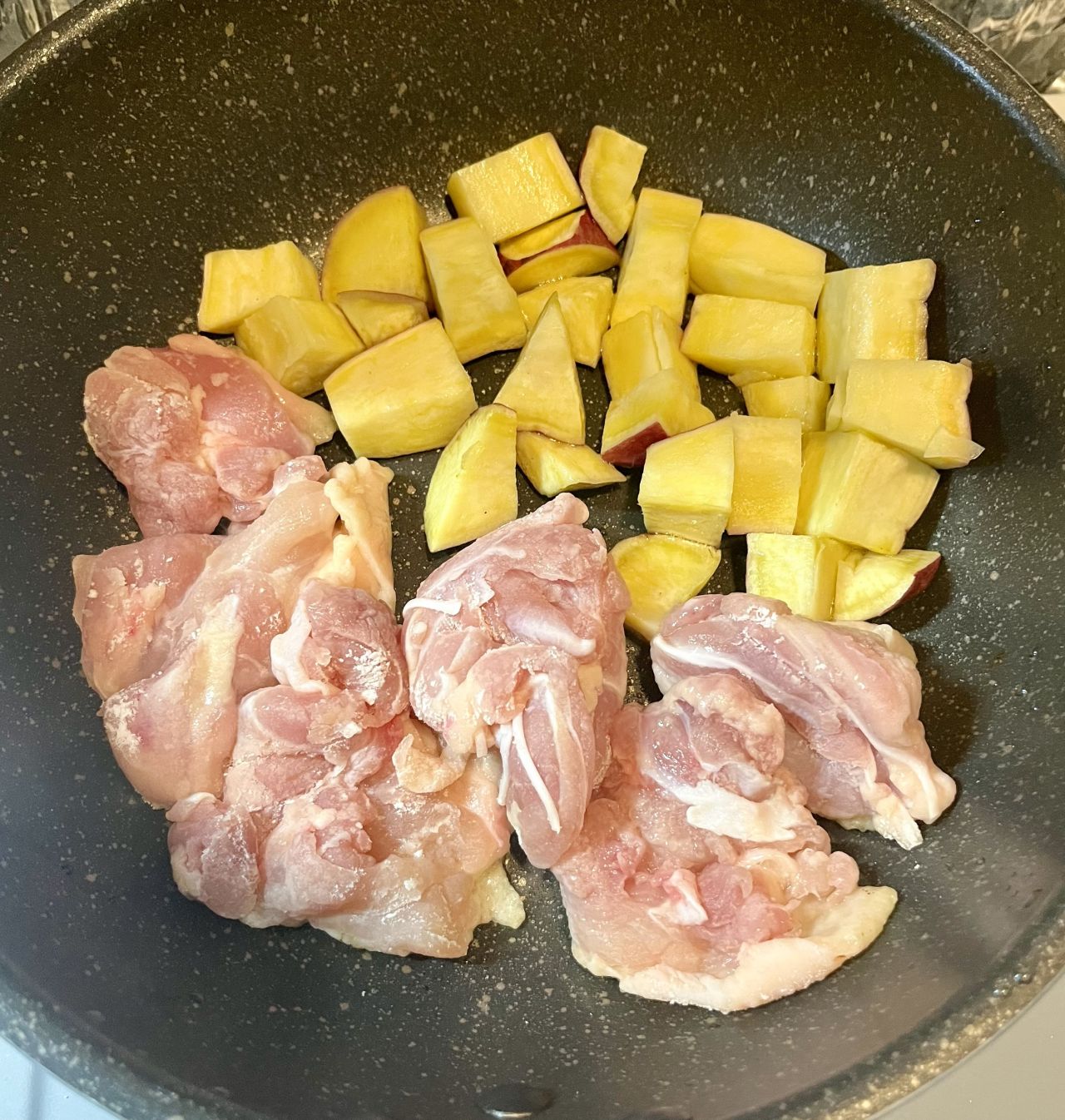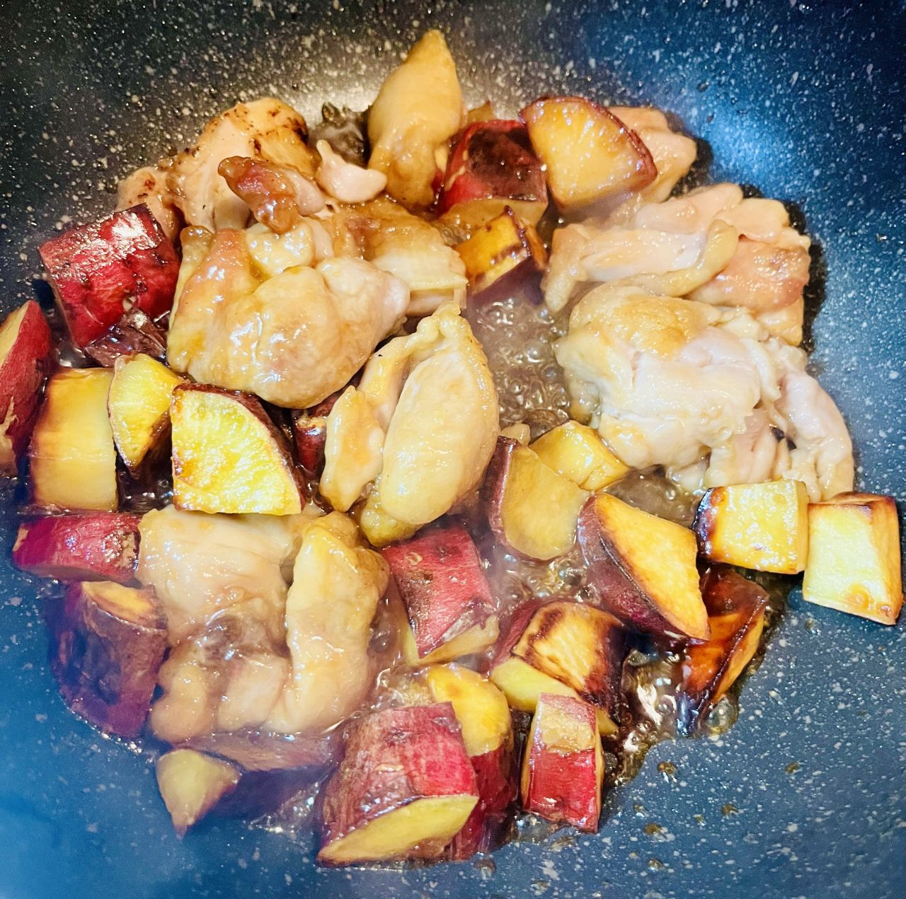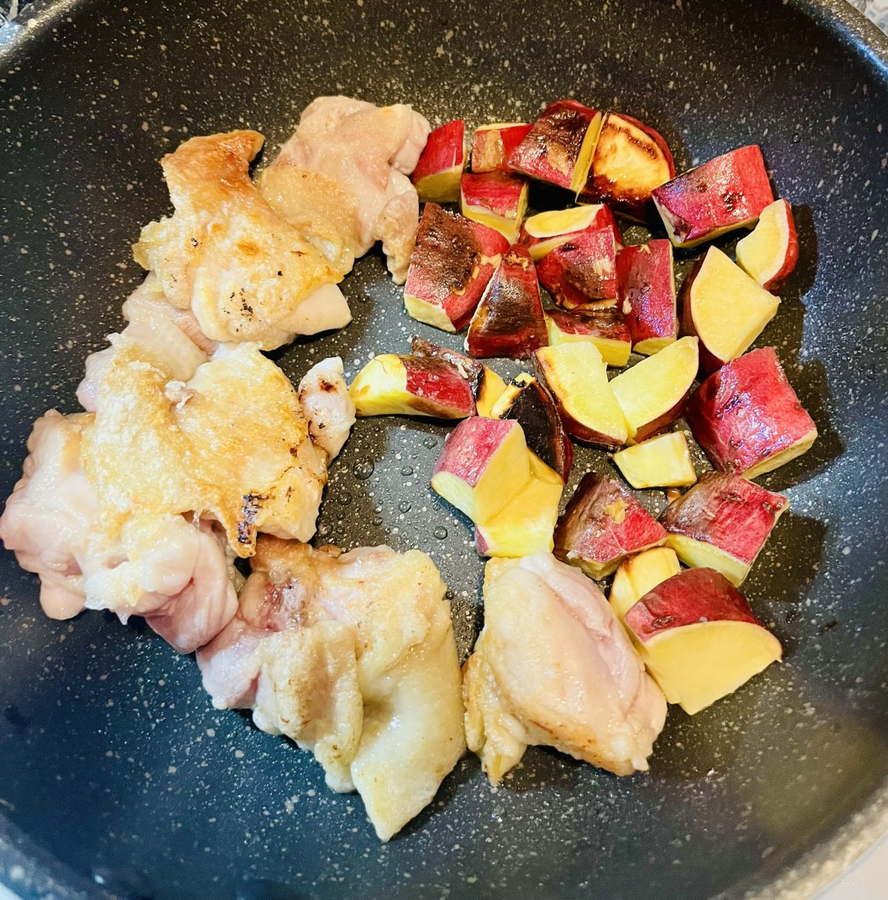 かんちゃんねるさんのレシピ「ガーリックバターさつまいもチキン」を作ってみました。さつまいものおいしい季節。おいしいレシピと出会いました。