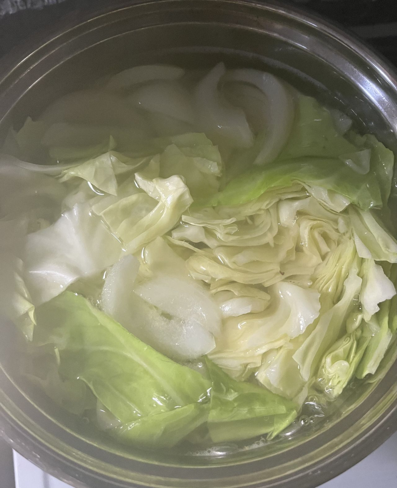 芋はレンジで加熱してから入れましたが沈んでしまいまして最初は写ってません。湯気でスマホのレンズが曇っています。調理の臨場感!もうこれでコンソメ入れて飲みたい気分でした。
