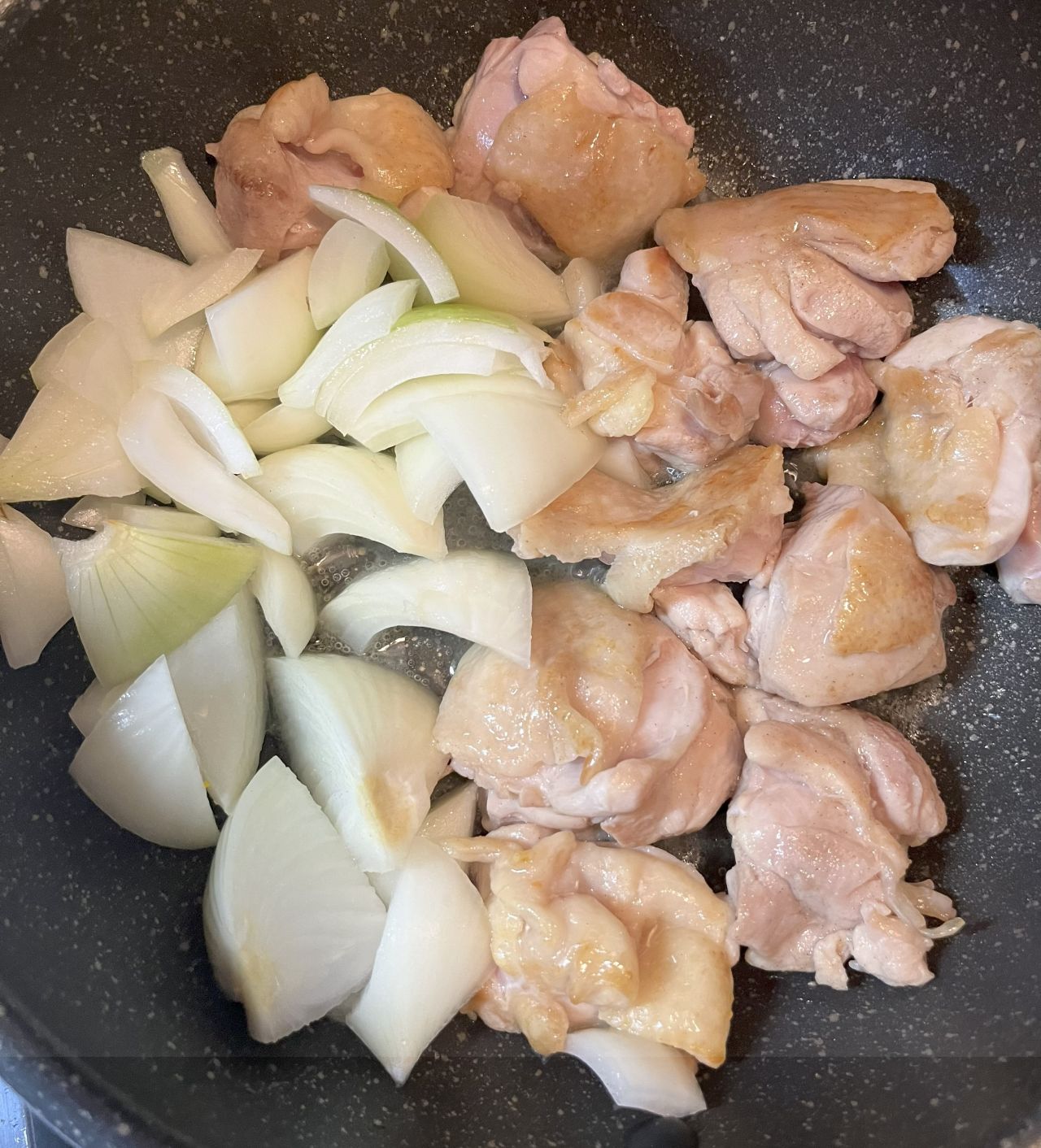 今回レシピ動画ではかぼちゃ450gとあったのですがちょうどいいサイズがなかったのでやや大きいものを採用。レンジ加熱している間に玉ねぎ、もも肉を切って炒めているところ。玉ねぎ、大きくカットしすぎ・・・