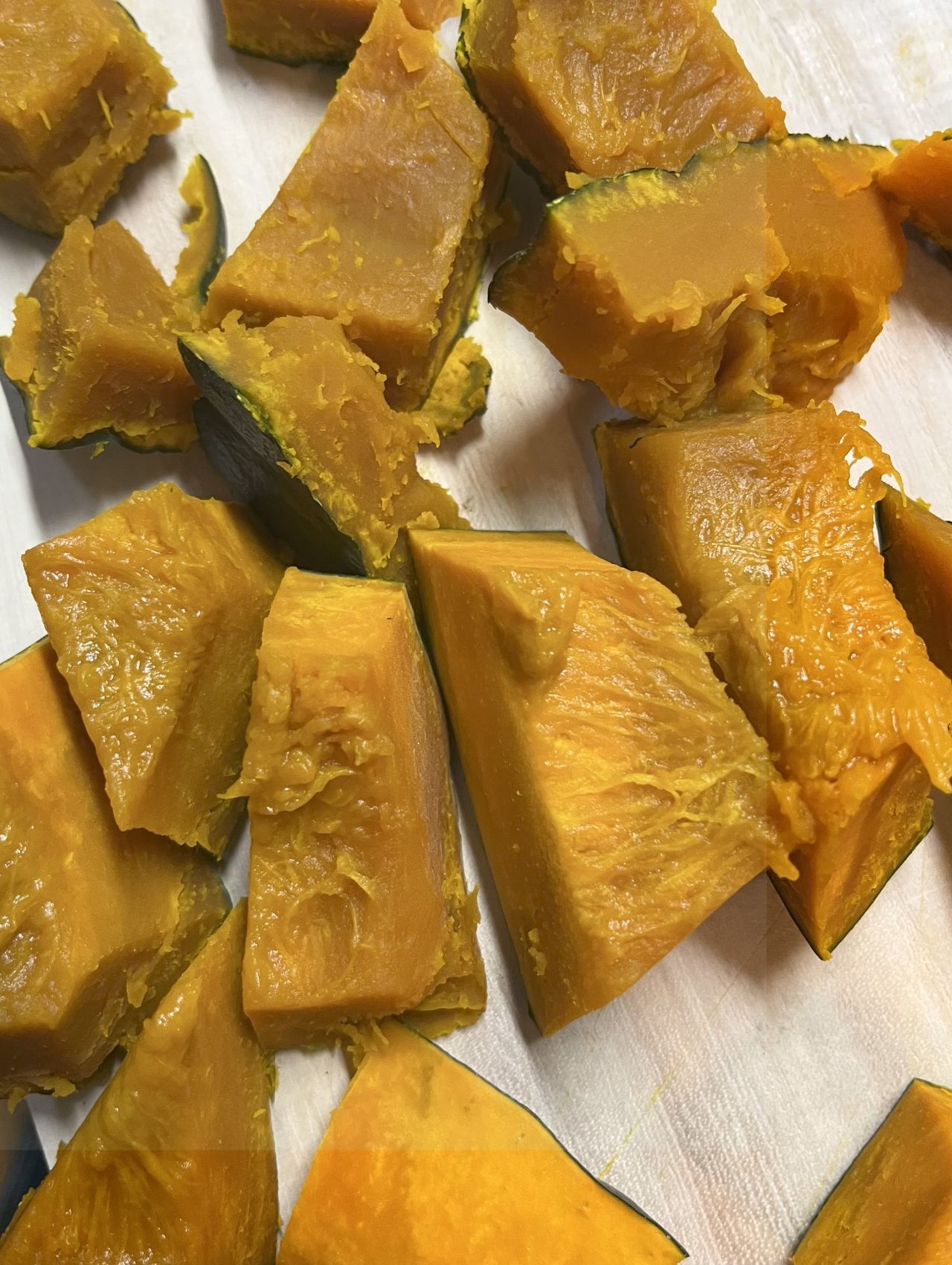 レンジから出してカットしたかぼちゃ。とても柔らかくなっていて包丁でスゥっと切ることができました。驚きです。カ