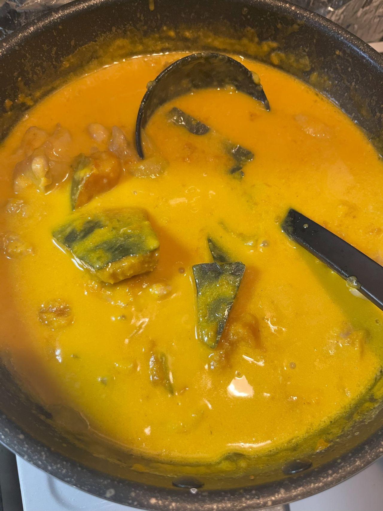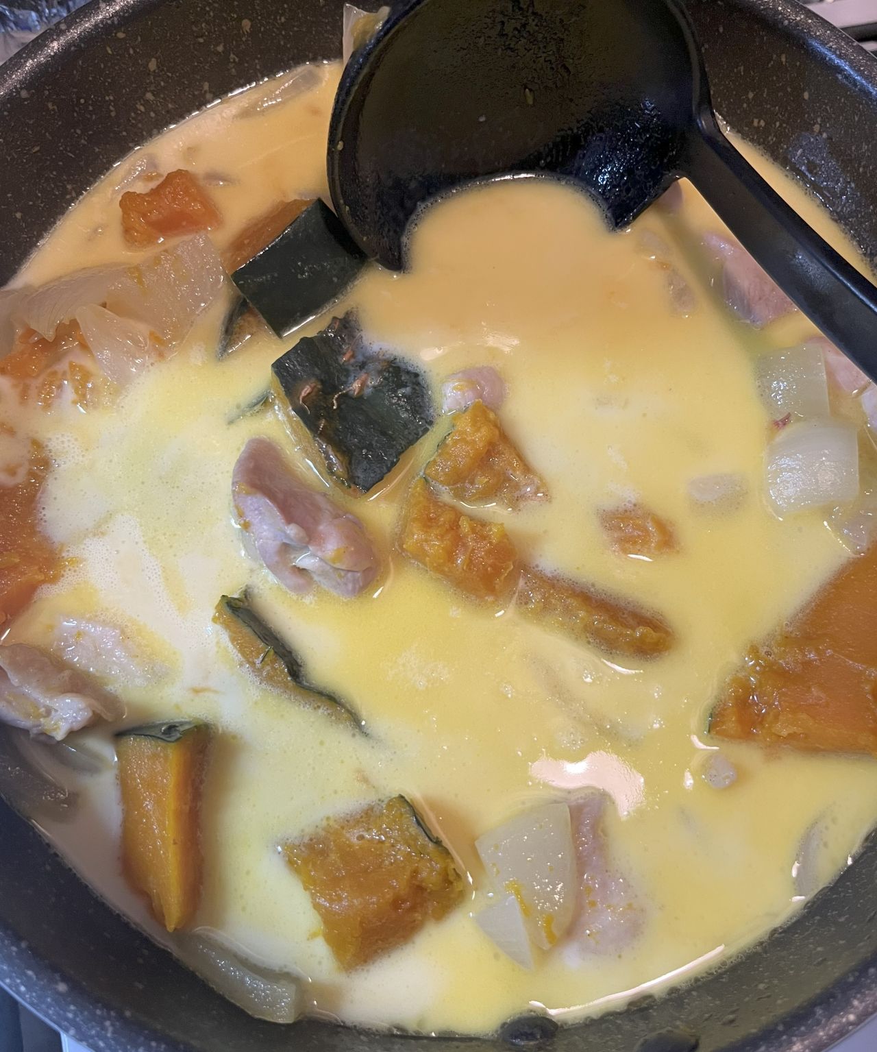 煮ているとかぼちゃが崩れてだんだん黄色いシチューになってきます。ブールマニエも入れてとろみも付きました。確実にうまいですね。これは。