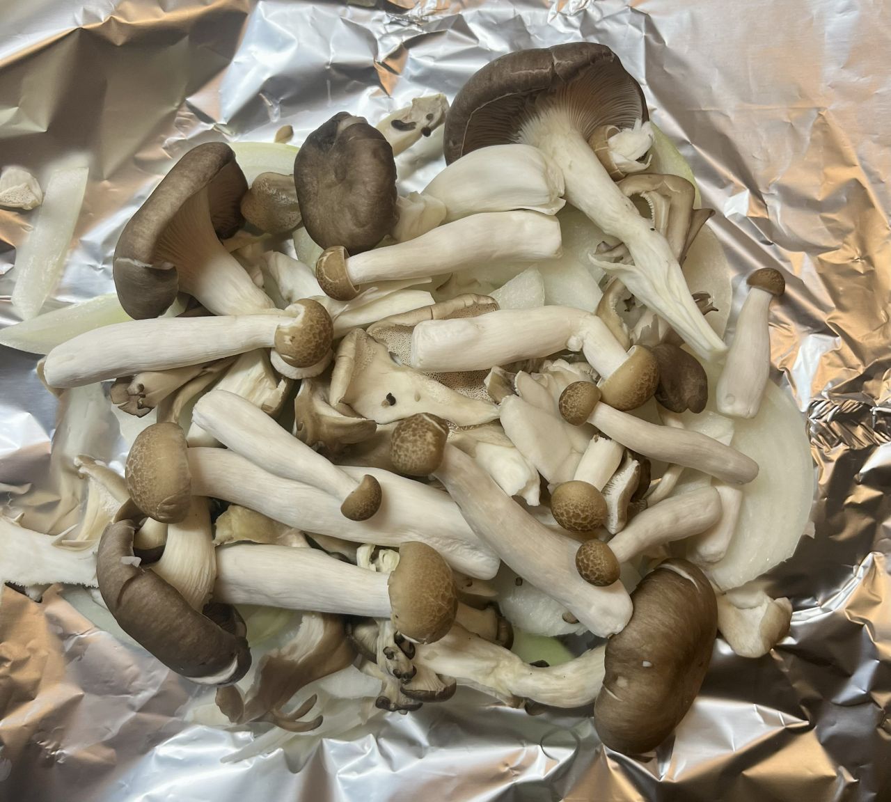 玉ねぎ、キノコたち、鮭レモンを乗せましたホイルで包みました。ちょっと大きくなりすぎたのでフライパンに入るかと思いましたがギリギリでした。ちょっと鮭がね大きかったんです。